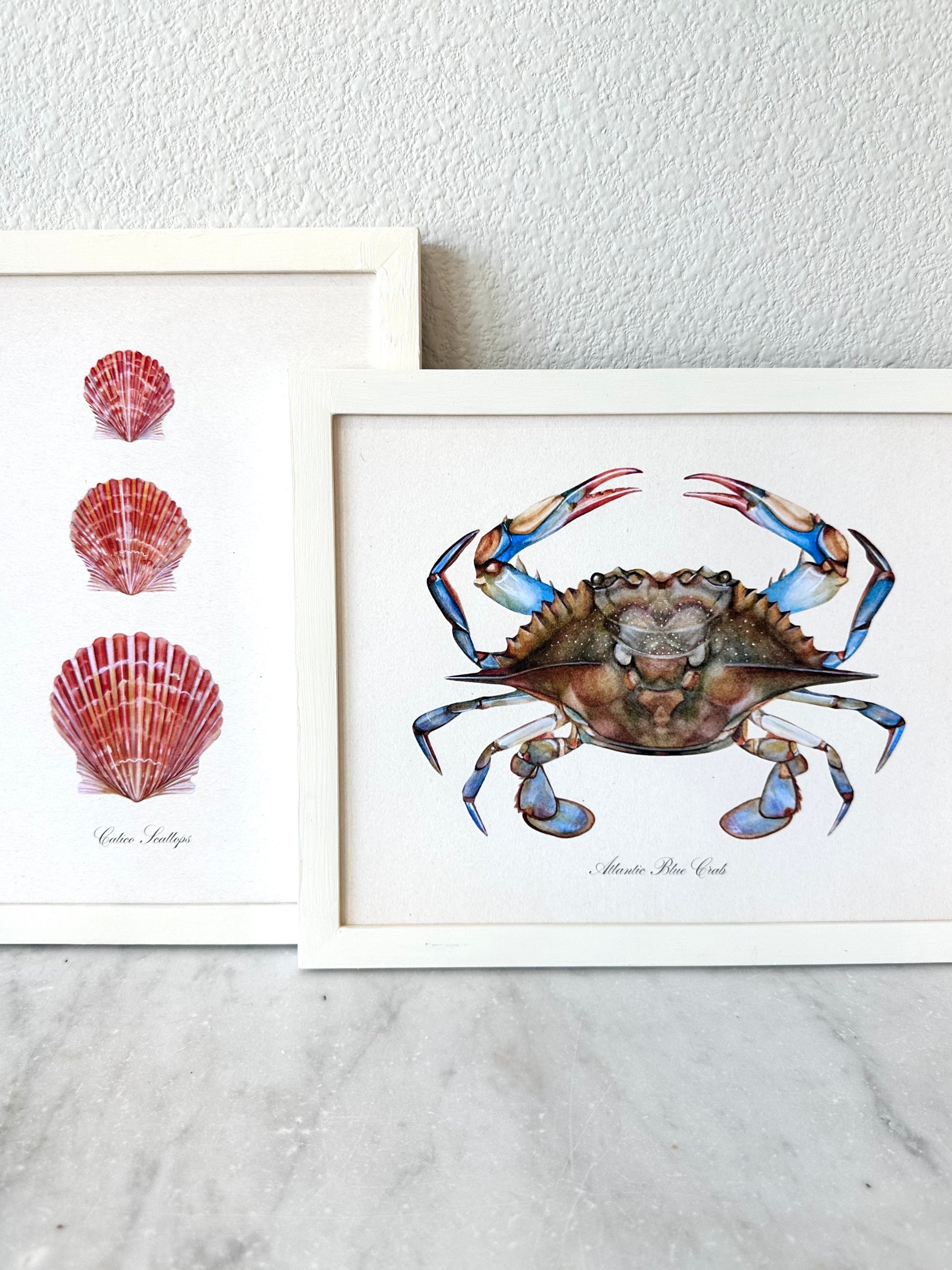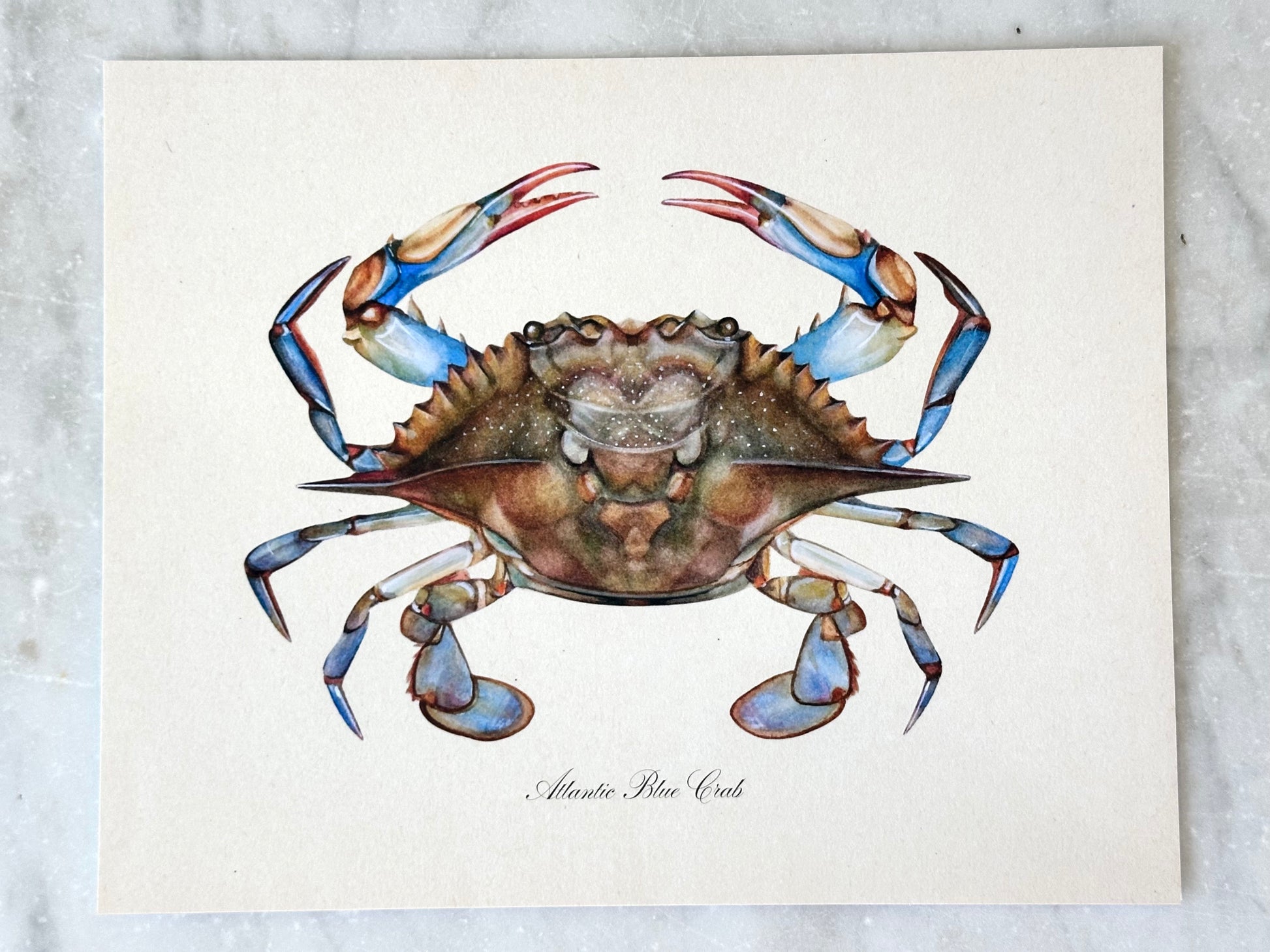 Watercolor Blue Crab print on vintage-style paper background. Printed on archival paper and ink by Hadden in her studio.