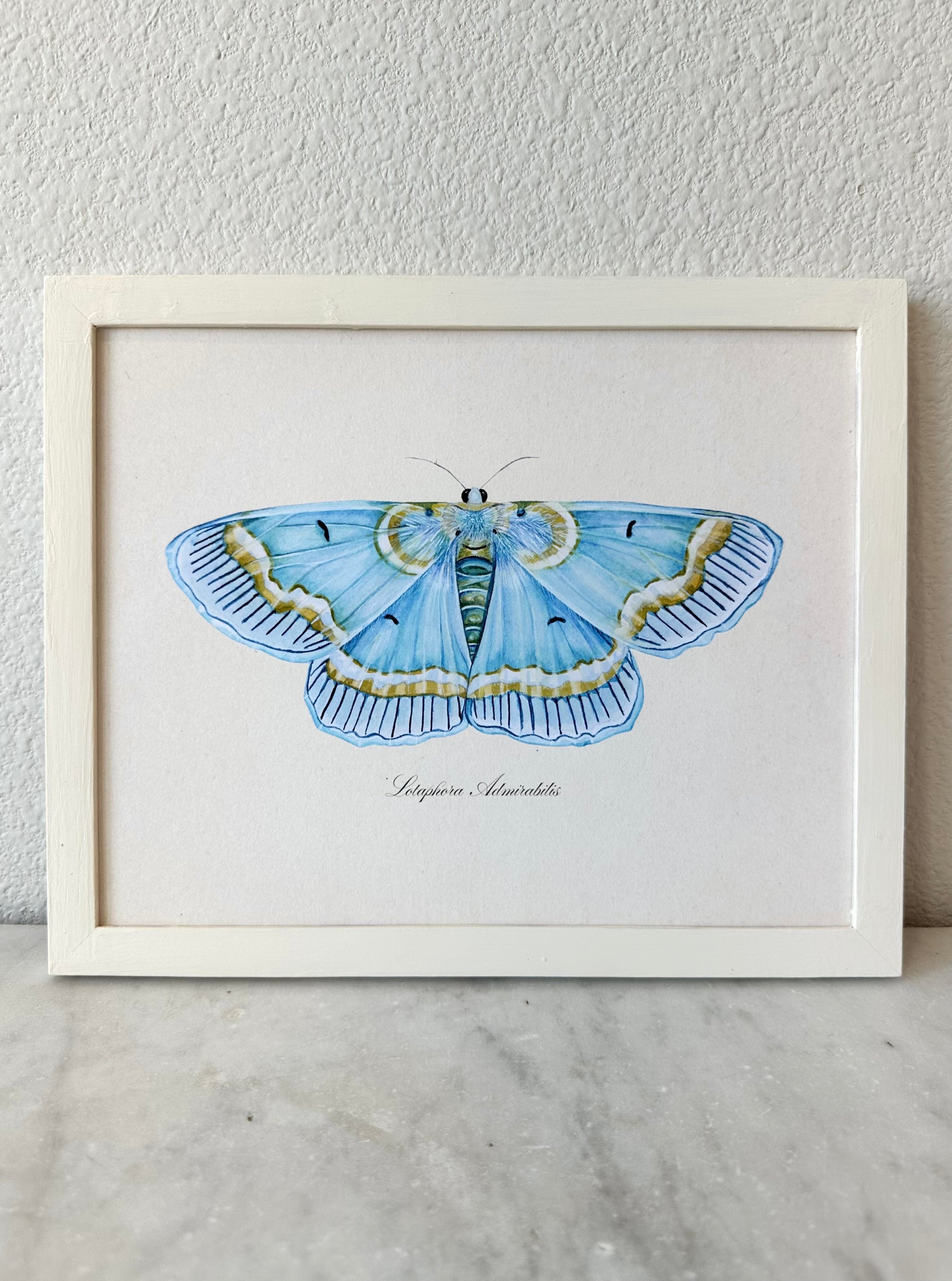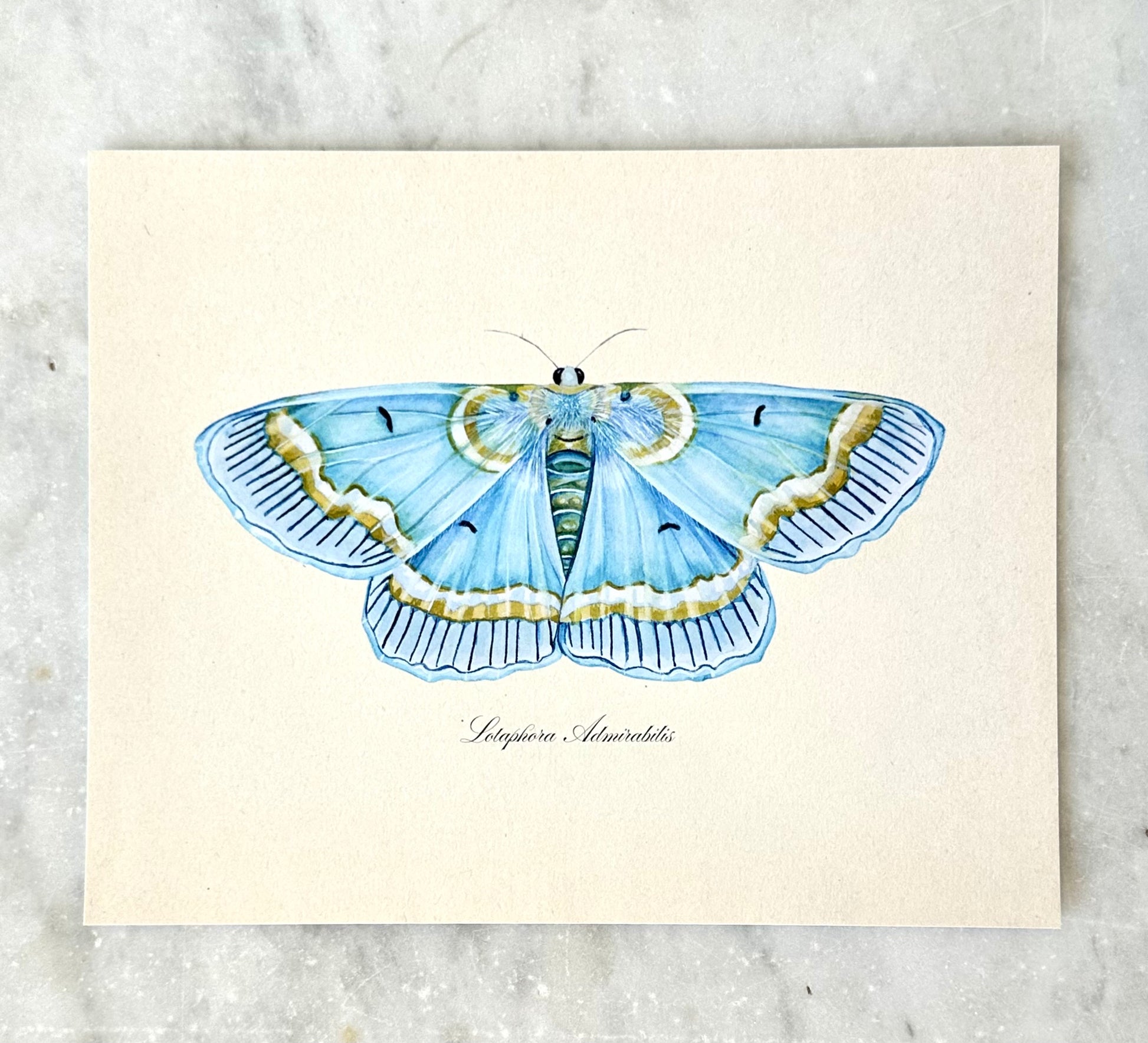 Blue Moth on vintage-style background. I would describe the background as a creamy with a light vintage patina.