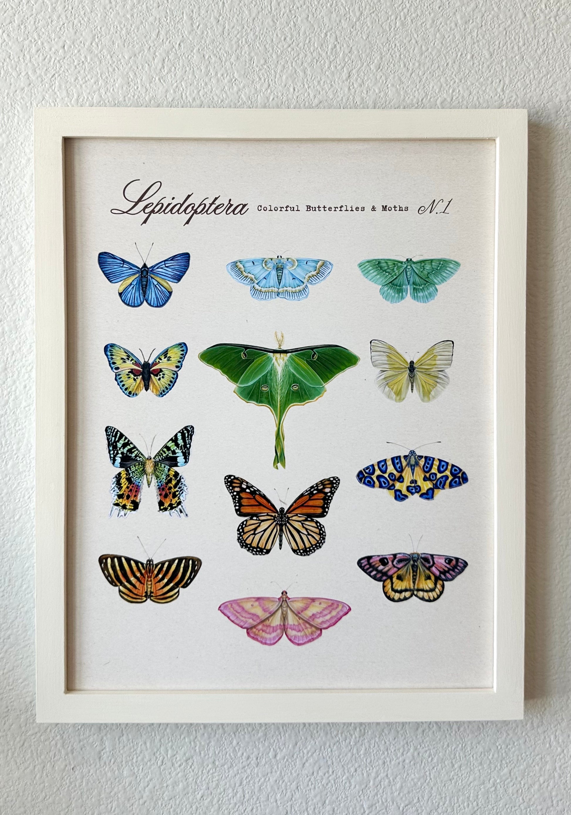 Colorful Butterfly + Moth Taxonomy on vintage background. Printed on archival paper and ink by Hadden in her studio. Artwork by Hadden Sharapov.