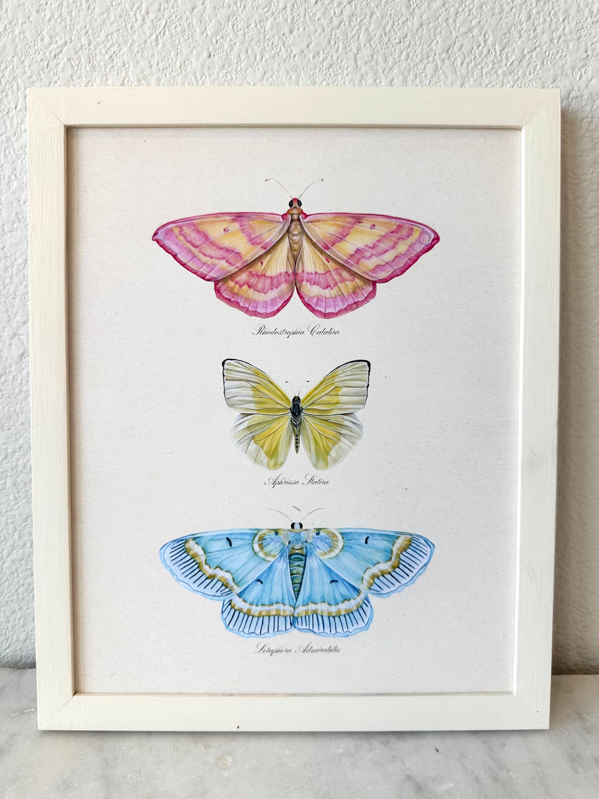 Butterfly Trio 2 watercolor print featuring pink moth, yellow butterfly and blue moth on vintage-style background. I would describe the background as a creamy with a light vintage patina.