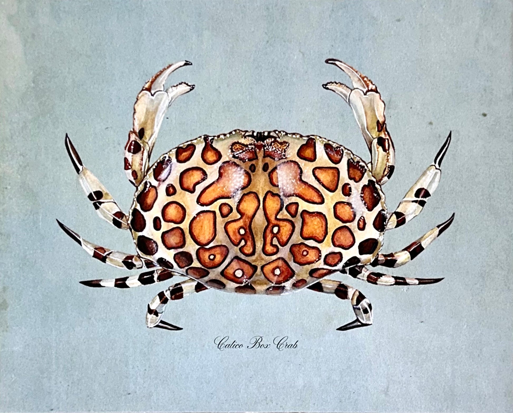 Calico Box Crab print on blue vintage-style background. Printed on archival paper and ink by Hadden in her studio.