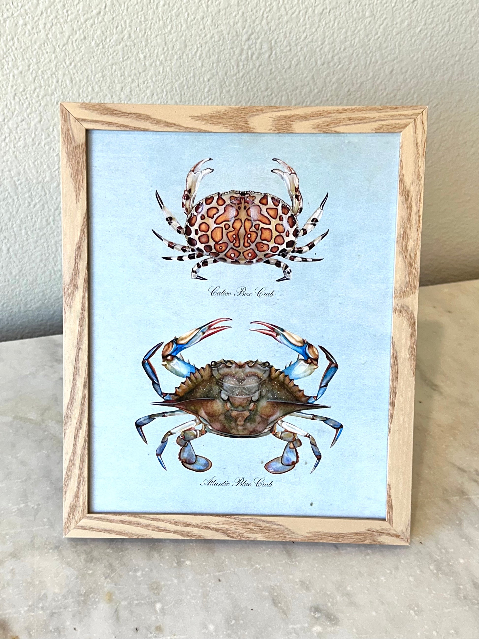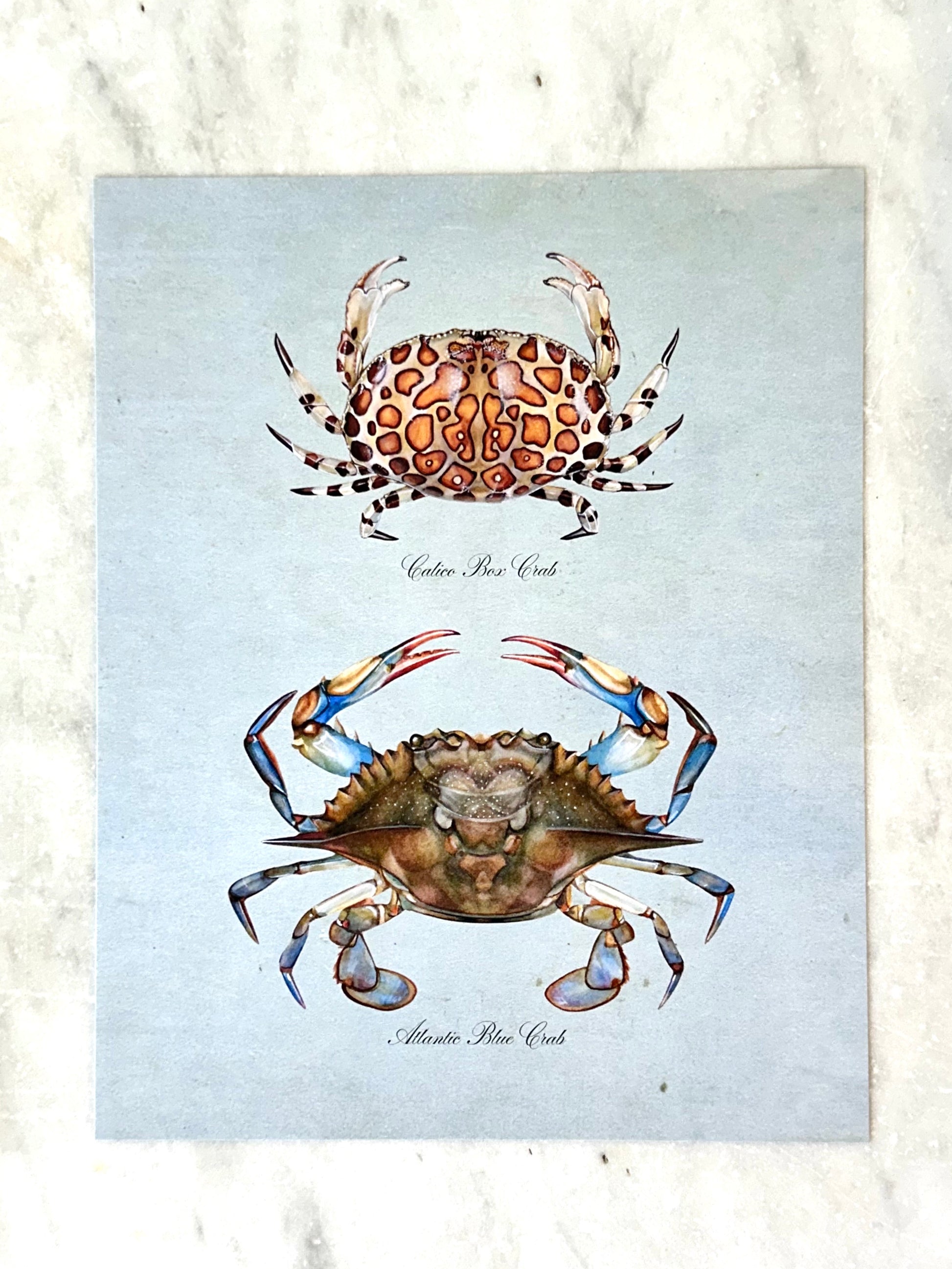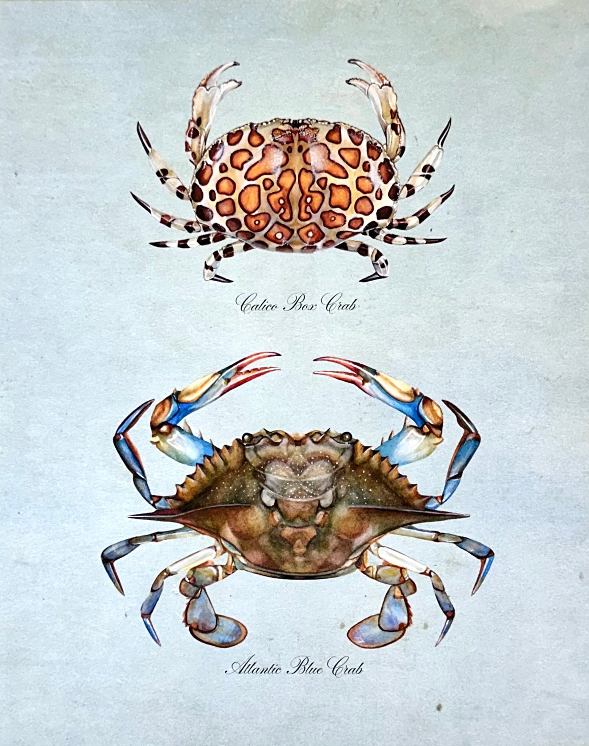 Crab Pair on blue vintage-style background. Printed on archival paper and ink by Hadden in her studio.