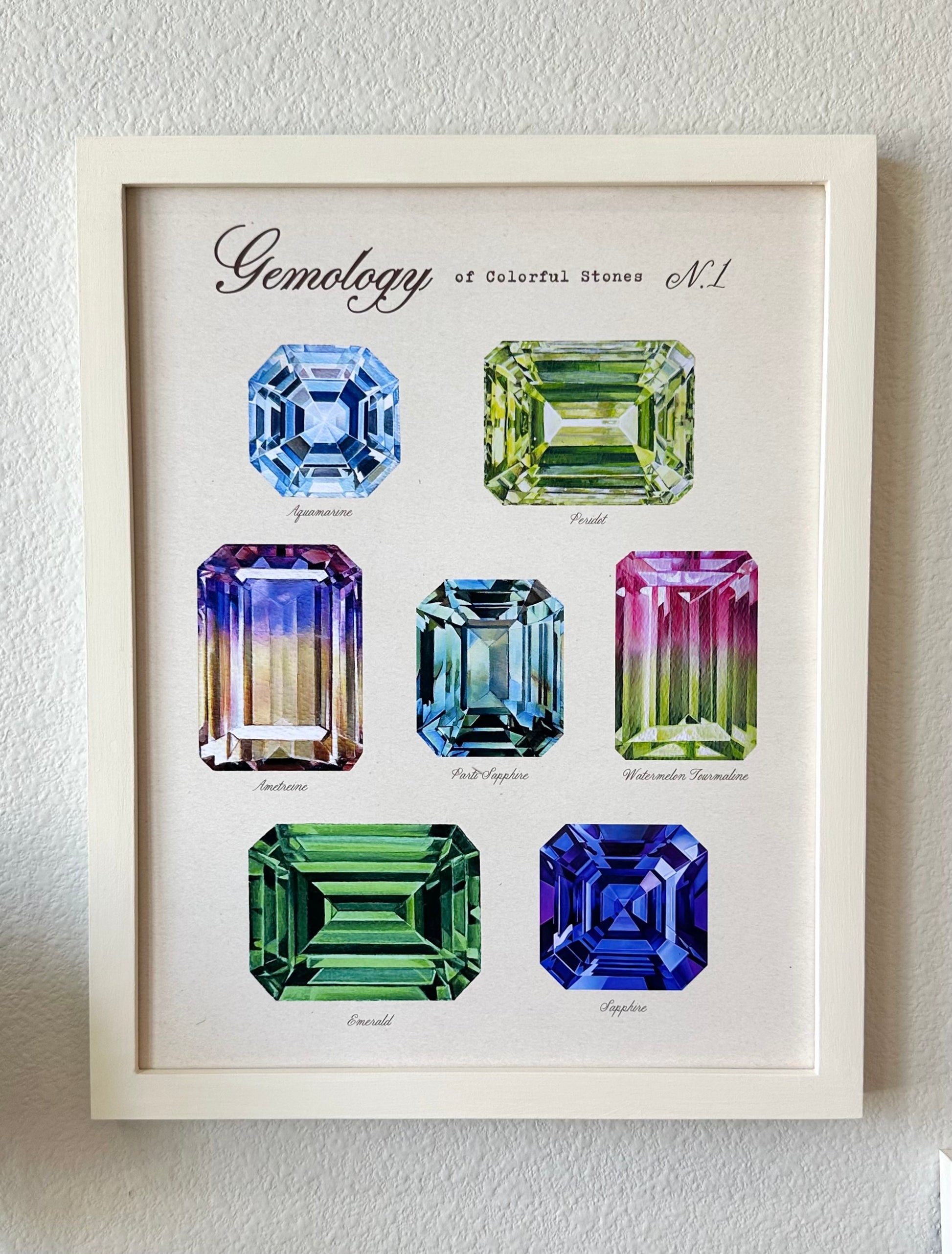 Gemstone Taxonomy print featuring bright and colorful gems of the world with a vintage-style background that has a creamy and light patina.