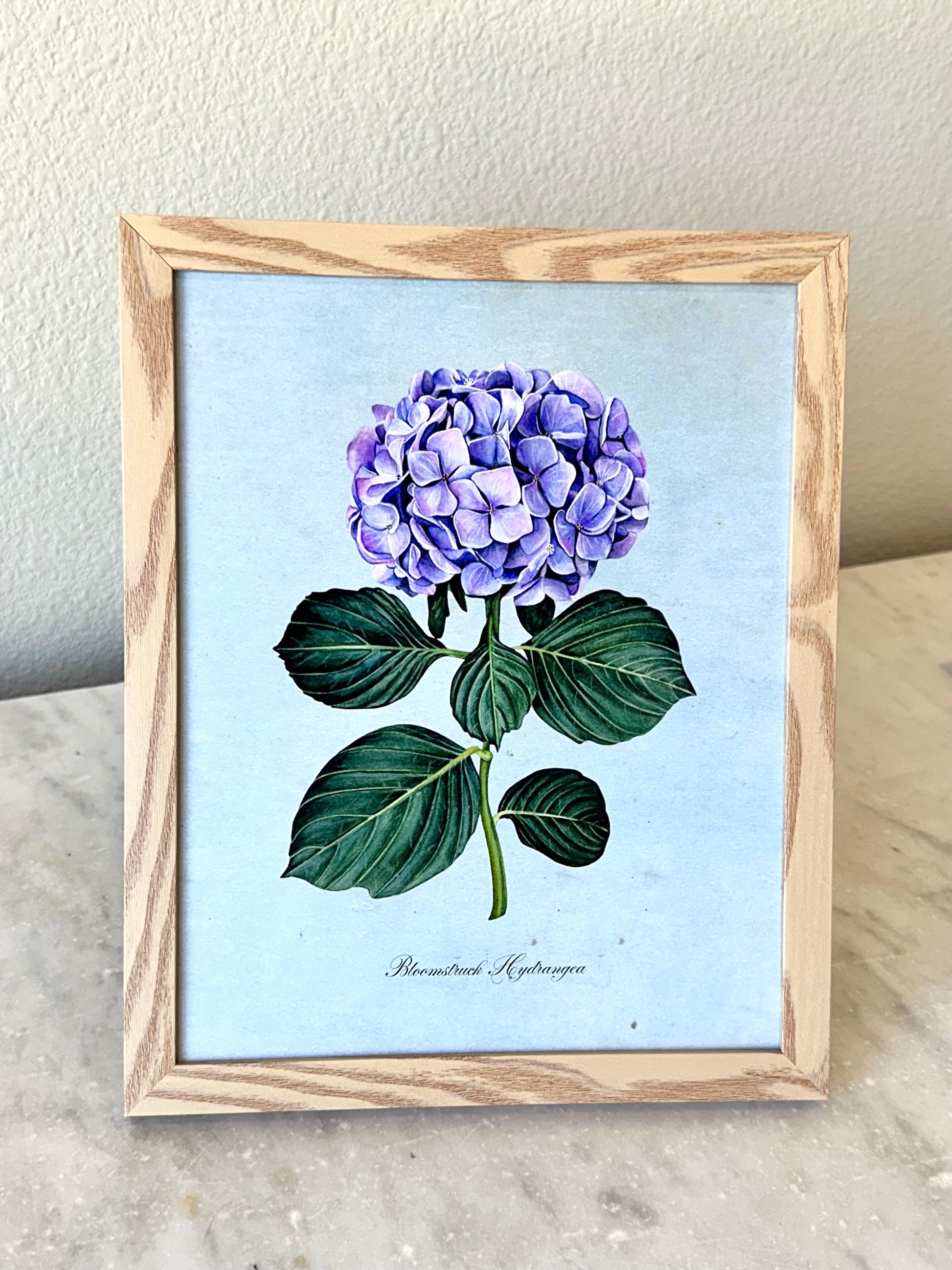 Hydrangea on blue vintage-style background. Printed on archival paper and ink by Hadden in her studio.