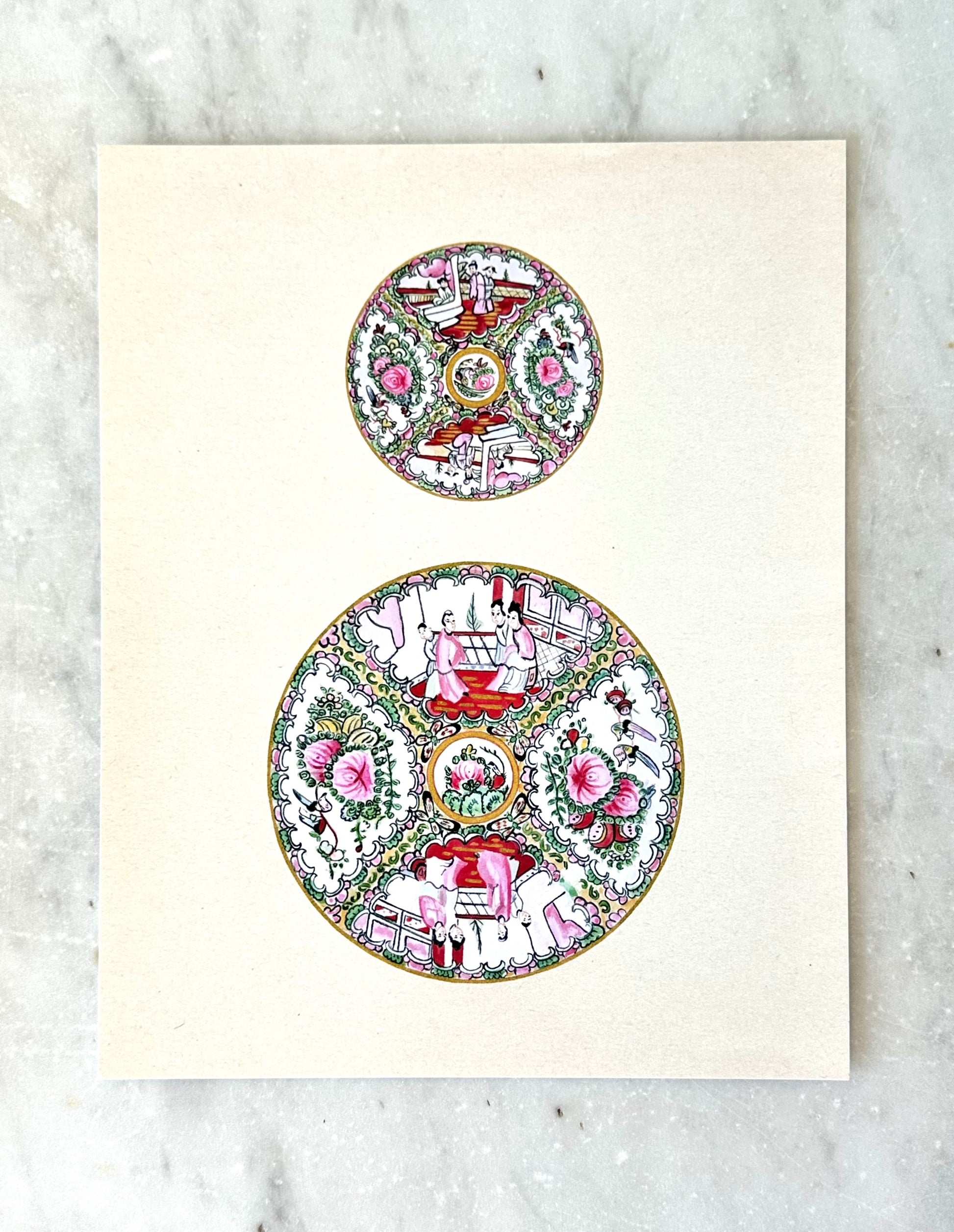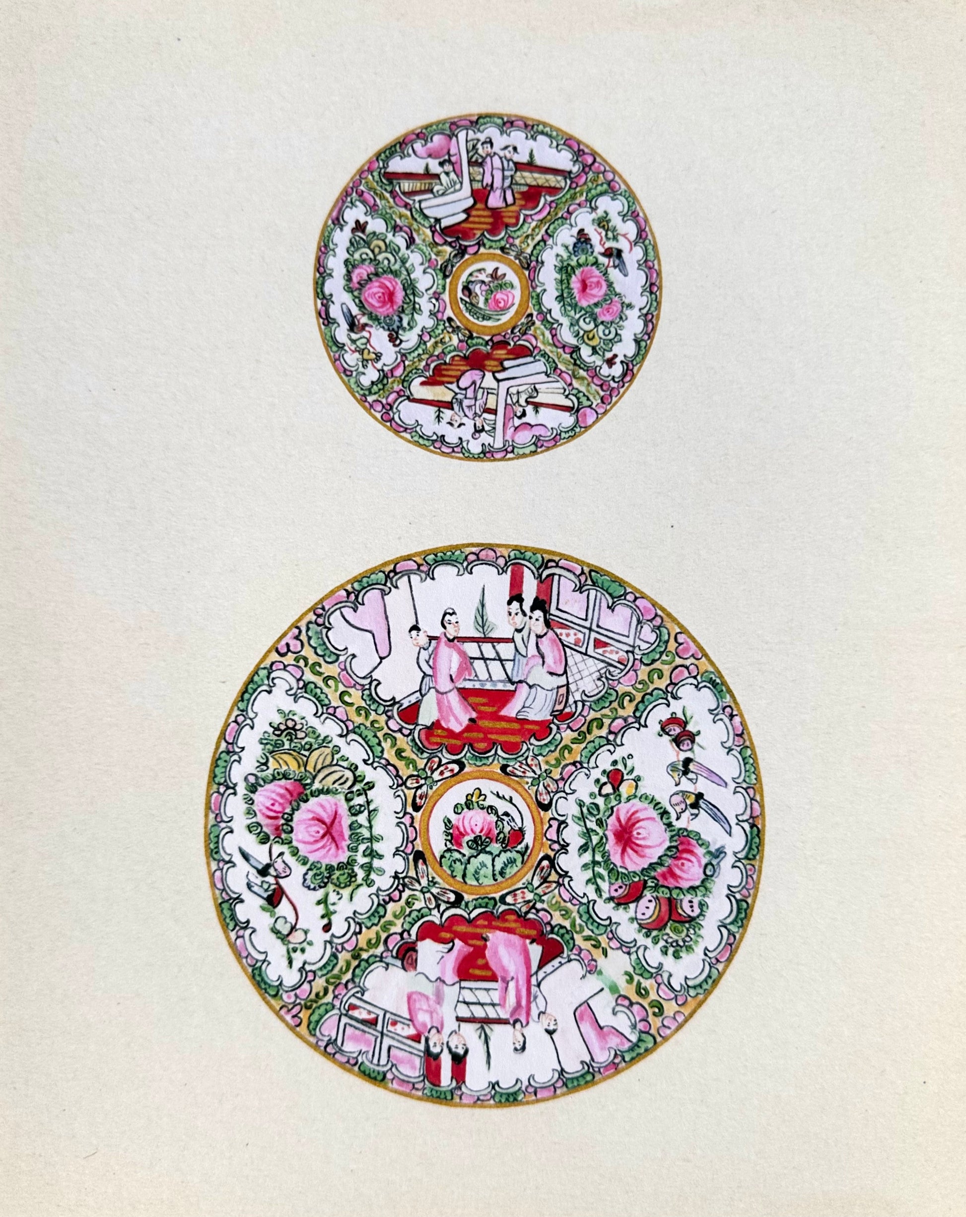 Small and Large Rose Medallion chinoiserie watercolor vintage plates on vintage-style background. I would describe the background as a creamy with a light vintage patina.
